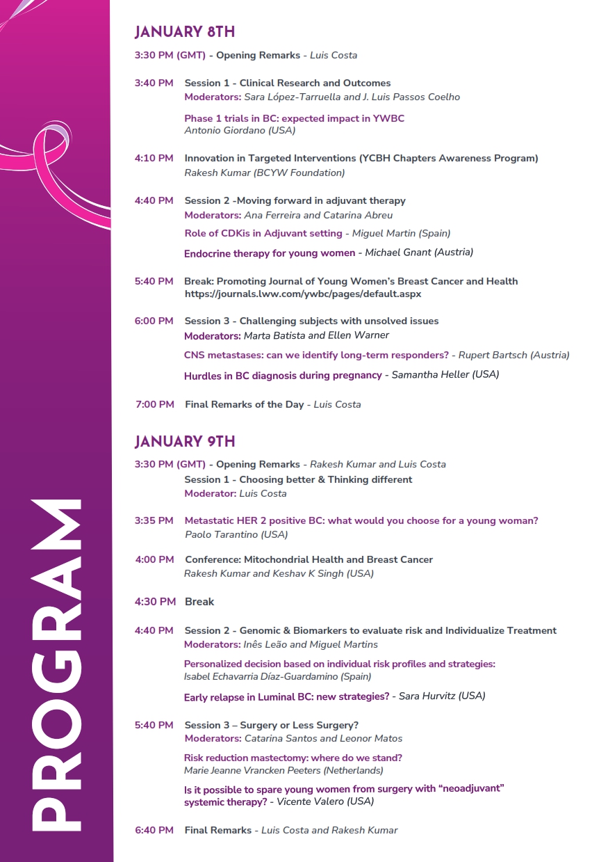No próximo dia 8 e 9 de janeiro 2026, vai realizar-se a 1ª Reunião intitulada “Progress in Breast Cancer Research and Care for Young Women” em formato online.